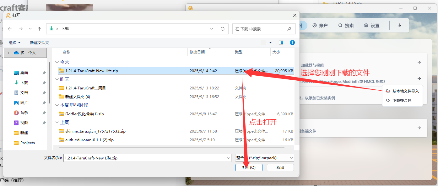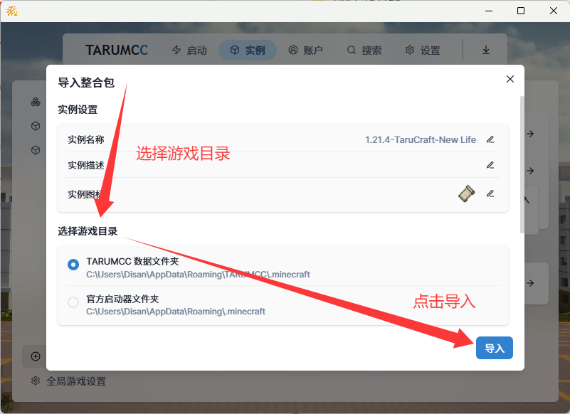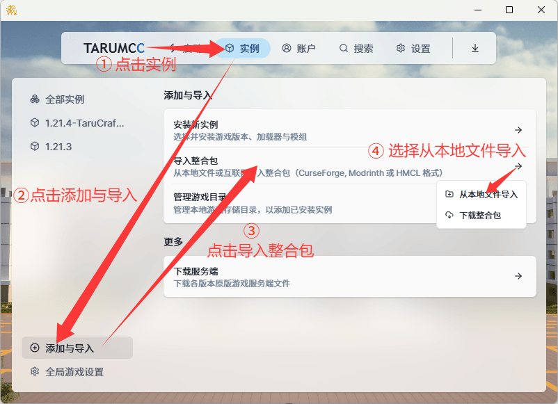 打开TARUMCC,点击实例,点击添加与导入,点击导入整合包,选择从本地文件导入。