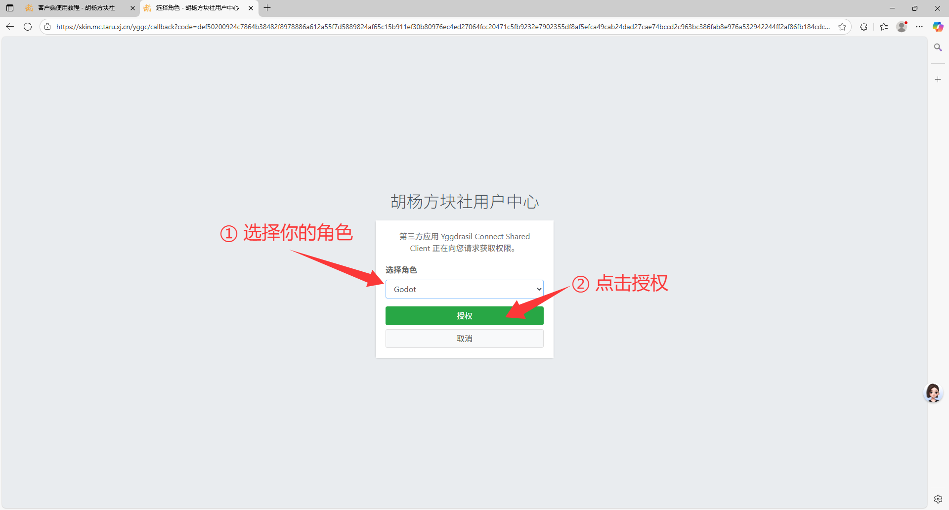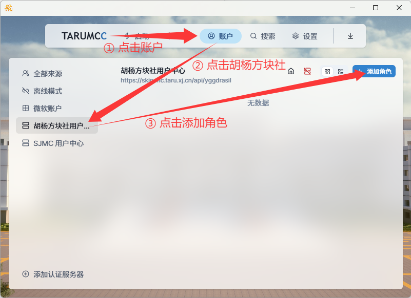 接下来您需要添加角色。点击账户,点击胡杨方块社用户中心,点击添加角色