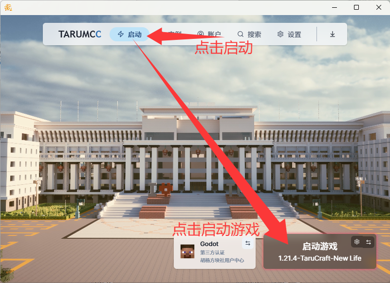 。(由于启动器无法检测校园网的IP信息,首次启动TARUMCC时请使用热点连接)