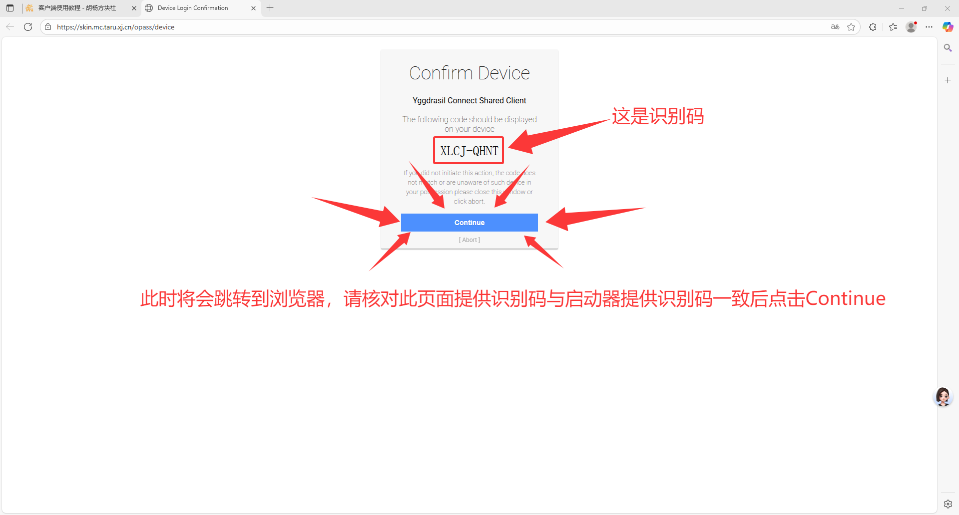 此时将会跳转到浏览器,请务必确认页面代码是否与浏览器一致之后点击Continue